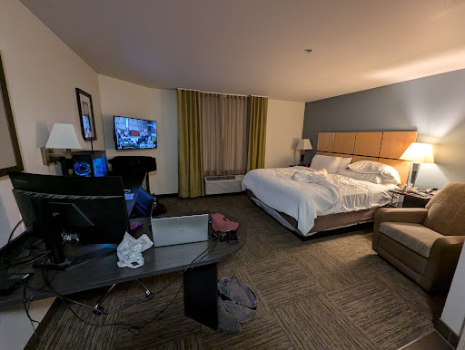 Read moreMatt checked me in and is the sweetest person! He was extremely helpful and has great customer service skills. He greeted me with a smile from the minute I walked in. He made check in super easy and answered all of my questions. We needed to stay for the weekend with our dog. Pet fee for 2 nights is $25. It’s does increase depending on length of stay. In comparison to other hotels, this is a great deal! Some hotels charge exorbitant pet fees. I wasn’t too happy when I received a room by the elevators. In past experiences, it can get loud and I was worried our dog would go nuts hearing people getting on and off elevators. I was so surprised when we could barely hear a thing outside of our room! It was a very quiet stay! We had a king bed suite, it was very clean! No pet hair or strange odors. The kitchen comes fully stocked with silverware, paper towel, plates, bowls, etc. There is a big fridge, microwave, small double stove top, sink, coffee maker, and dishwasher. Bathroom was clean and had plenty of towels. Comes with body wash, shampoo and conditioner in shower. (No hair dryer ladies!) Linens were very clean. The bed was extremely comfy. Coffee and tea is available in room or down in the lobby. There is an inexpensive cafe to purchase drinks, snacks, etc. I honestly wasn’t expecting much from this hotel, but was pleasantly surprised and happy with our stay. It exceeded my expectations. Great customer service, clean and stocked rooms, quiet and comfortable. If you’re looking for an affordable stay but also quality,...