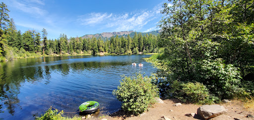 Lost Lake campground is a very rustic area about 3200 ft elevation. The lake itself covers about 6 acres. There are no restroom facilities and no water. The area is breathtaking with pines surrounding the lake and mountains in the distance. I arrived early and the sun was causing a mist to drift across the lake. The road up is rough with potholes only a couple big enough to swallow up your car lol just kidding about size there are plenty but is possible to drive around or straddle most of them. On the way up I needed to stop twice 1st for a doe standing in the middle of the road 2nd time for a herd of elk crossing the road saw 3 bulls and about 12 females. Continued to see deer near the road untilI lost count. After I was settled in fishing a bald eagle made its presence know by swooping out of a tall pine nearby. I would recomend worms as bait if you come to fish. There are some BIG trout in the lake. I hooked a couple in the 18 to 20 inch long size probably a ciuple...