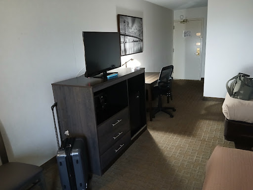Read moreA group of us were sent here after American Airlines caused us to miss our connection. The shuttle service was excellent. And the staff at reception was also excellent. But, that's where it ended. We waited in the restaurant for over 40 minutes just to get some water, sodas and 2 beers. Then, we waited again for our food order for almost an hour and 20 minutes. Most of this just consisted of B. L. T's. Not a time consuming meal. After having to follow up about our order 4 times, we were discussing walking out and going elsewhere. After getting to my room, I really needed to use the bathroom. I was very disheartened and exhausted when I had to clean my own toilet in order to be able to use it. I had placed my luggage at the end of one of the beds and when I picked it up to take items out of it I saw that the entire bottom and edges of my luggage was covered in probably a few inches were absolutely caked in dust, obviously not vacuumed for a LONG time! There was black hair all over the Bathroom faucet and floor, poop spattered under the toilet seat and rim. There was dark, course public hair on the toilet itself. Gross! There were large stains all over the walls n hair and dirty floors, dirty counters, mirrors, dusty furniture and the big light in the room was broken or the bulb was burned out. The slider door was unlocked and I struggled to get the entry door locked so I had to use the safety lock.The fridge was completely frozen over and there was leftover food/snacks left in there. I was so appalled at the condition and cleanliness of the room that I tore covers off both beds to check for bed bugs. I then got a look at the pillow and mattresses and I didn't even want to sleep on them. The bed coverings and "blankets" are useless and there are none others in the room. I considered asking for another room but there was a wedding going on in the hotel and it had been a very long road from back to the United States. I was just too tired to deal with the situation.