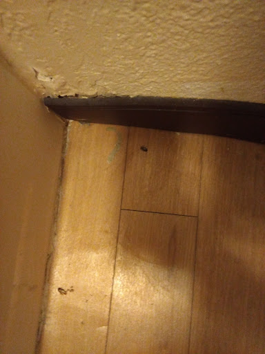 Bare floors, fake wood. Tub surrounds installed sloppily. Paper thin walls. Paper thin ceiling. Alarm clock that, while not at all set, lets out a range of static noises come 6:30 a.m. Toilet runs. Scratchy towels. A safe in room with king bed. Non-smoking, but the prevalent smell of tobacco trying to be covered up. Parking pass provided. Non-premium TV channels. Nice TV. Nice desk and chair. Ironing board and iron provided.