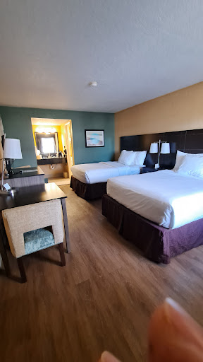 This is the second stay here. We needed to flee Jax due to incoming Hurricane Idalia. The reason we picked this place again is because we were there a year earlier and really liked it. It's not the nicest or fanciest place, but the staff was friendly, and believe it or not, we loved behind the hotel is a pretty pond filled with curious gators. Beautiful property back there with a walk bridge and a gazebo. Loved the breakfast ladies and the breakfast. This time, we were very disappointed. The staff was overall nice except for one night office staff. We didn't get in until midnight, and when we got in our room, one bed had a wet spot on the covers. The whole way through, we didn't know what it was. So we were down to one bed. We had our service dog, and we have a new fur baby that's 12 weeks old. He has a crate and uses a pad. Well, unfortunately, our baby was playing on the bed and had a small accident. Nothing major, but we only had that bed. So i called down to see if we could get new bedding for both beds. It was too late the night before when we got in to "complain" about the other bed. The office girl said she could come get them, but she didn't have blankets. She offered to change our rooms. But we had so much with us, and all unpacked, we passed. I was surprised they didn't have blankets. I mean, it's a hotel. You're supposed to have more than enough of these things, not JUST enough. I'm an avid traveler, I know that at least. So we kinda were chilly that night. Still don't understand why she couldn't just wash them and bring them when they were done? Or even take the linens off the room she was going to move us to? But I digress. They are supposed to do daily light cleaning of the rooms... switching towels/washcloths, changing garbage, etc. They didn't. We had to finally ask and even talk to the maids nearby for some toilet paper, take garbage, towels, everything. The maids were very friendly about it. With having puppy pads to change and being there for 4 days, we needed assistance. It was getting ripe in there. Lol Our room wasn't very clean. The floor was filthy. Our furbaby found a full water bottle under the bed. The shampoo, conditioner, and body wash dispenser were practically empty. The breakfast was still nice. We would have like to see more picks for the eggs and bacon, hash, and sausage, but overall, our tummies were full, and we got our coffee fix. The lady working was very sweet and went above and beyond. She had overheard me expressing I was sad that there weren't any yogurt cups. (I wasn't complaining, I was just telling my bf, in a sad kid voice, with a boo-boo lip. Lol) Well, she went and made a few more cups so I could have one. It was so sweet! I was surprised and so happy! I had eaten enough by then, so I made sure I took one to my room. She even stopped me as I went out the door. She was afraid I didn't grab one in time. She is so sweet and caring, and she does her job very well. I wish I had remembered her name, but she deserves a raise , promotion, recognition, something! As for the back, behind the hotel, it has been sadly let go. The pond was covered in the green slug. Not a gator in sight. We wanted to see how much the young ones grew. They said there's 4 back there now, much less than last year. But we didn't see any other than the belly rub markings in the grass from going in and out of the water. No other wildlife, no turtles, etc. The gazebo was torn up, bench practically gone, just the frame. It was so pretty there before. Last year, they came to the room every other day and took care of the room, even changing the bedding and garbage. I don't know if there's a new owner or not. We met the owners last year. We'll, it's no longer going to a place we enjoy visiting or staying if in...