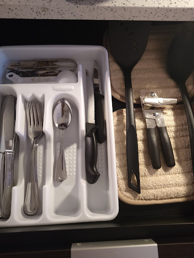 Let’s get on to my room. I entered and there was a long tiled area that was a full kitchen (everything included for a long term stay). You walk into the suite and there is a dining table that will seat 4, a large comfy chair, big picture window that brings in a lot of natural light – very spacious room. The beds were superior - soooooo comfy that I didn’t want to get out of them in the morning. The bathroom was very roomy and bright and clean and had a nice closet. The sink area had very nice countertops and I LOVE cloth shower curtains.