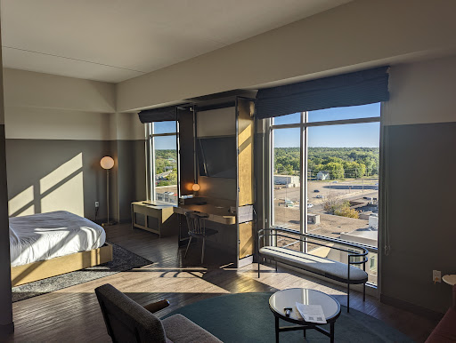 Read moreWe have stayed here several times. The hotel itself is very unique and the small details were a huge component throughout... the overall design is top notch! I feel like the best way to describe it is industrial-retro-modern. The rooms-minimalist approach with traditional comfort, very spacious & the beds are so comfortable, but I dislike their choice of an open rack for a closet, a variety of size options to suit your needs. The bathrooms-I love the modern design & title work plus the small amenities beyond toiletries are nice. The staff-friendly, accommodating, attentive and they all have very unique style from their hair, outfits, tattoos and piercings. We had the best experience at the bar with Kolton who is an aspiring tattoo artist & Caroline who went to school for theater & has killer green eyes! They went above and beyond... were great bartenders and company for conversation! The food-everything we ordered was delicious! My favorite was the steel cut oats and all the toppings for breakfast. They offer a coffee bar in the mornings. Outdoor seating for the main restaurant. The conference/event rooms/area was spacious with a really nice set-up. Additional perks-there is a main level outdoor area with fire pit & there is a "rooftop" deck off the 3rd floor with a view of the main strip where they host live music. The DETAILS-the bar stool are upholstered in a velvety sea-foam green fabric and are very comfortable, the long high-top booth seat in the bar as tiny former president statues lined up on the back, the lighting fixtures throughout are very unique and stylish, you'll find details throughout that pay homage to Cyrus K. Holliday (whom the hotel was named after) and Kansas throughout the hotel. The best addition to Topeka thus far. Kudos to the owner, Cody Foster for trying to revitalize downtown Topeka with The Cyrus as well as the Pennant across the street and the Iron Rail a short walk...