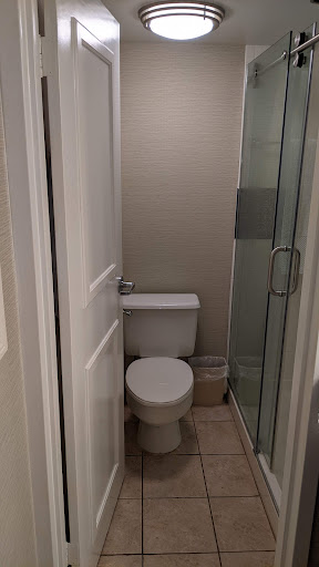 The bathroom is incredibly small, like REALLY small - with a toilet and small shower stall, barely big enough for a grown adult to fit in. Anyone with physical ailments or a larger person would have a tough time making it work.
