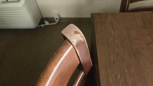 The rest of my review will be a few photos I took of the second room. Worn furniture, stained carpet, big scratches and marks on the woodwork. Oh, and a 2-switch light setup by the bed that's wired completely backwards (The left switch controls the right side light, and vice-versa). Another fixture on the wall did not work at all.