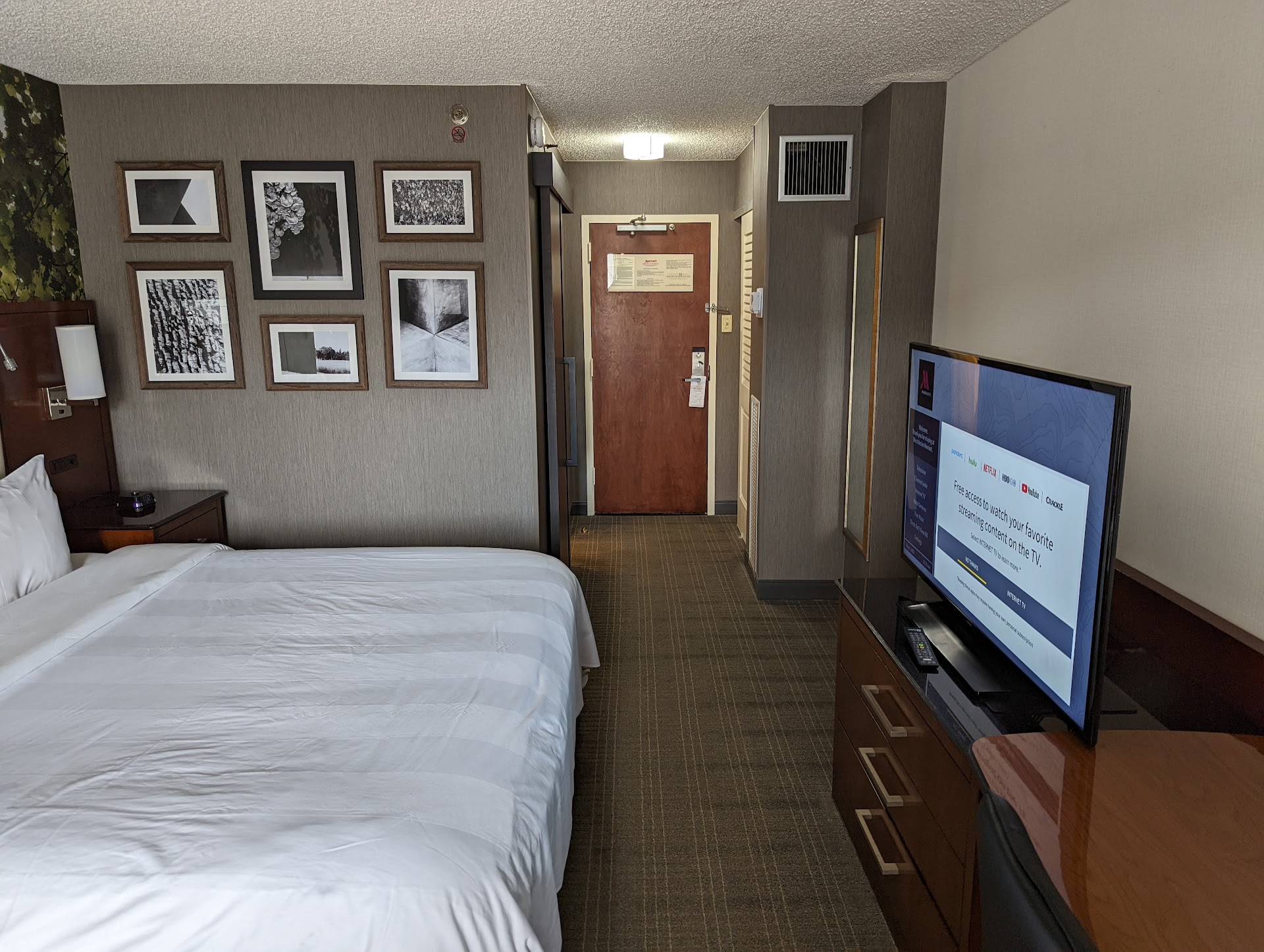 Read morePros: This hotel is indeed newly remodeled (so newly remodeled, parts are still being remodeled as of our stay). Our room was nicely redone overall, with a comfortable bed, a desk/chair setup, and (wonder of wonders these days) a guest chair as well. A long, padded bench seems to have replaced a luggage rack (we'd still like a luggage rack, thanks kindly). On either side of the bed, there was (gasp) a nightstand with room for glasses, watches and phones as well as ample USB chargers and outlets. There was room to stow a backpack or purse underneath. Hurray!||Our room had a scenic overlook of...the highway, and a little road noise did seep in even with white noise playing. We did not hear doors closing from the hallway, and we were one room shy of the elevator and heard no noise from that area either.||Small details: we appreciate the elevator system that tells you what elevator to get into for your destination, a nice, modern detail. We also appreciated free parking.||We had dinner in the hotel restaurant once. Food was good, service was lovely. Live music was setting up as we left, and might make it challenging for casual conversation (we didn't stay to find out).||Cons: We were a party of three, and we had exactly two bath towels in the room. Perhaps this is a cost saving measure, perhaps they expect you to ask for more towels...regardless, this is beyond annoying. Bare minimum, three towels please.||There was no way to turn down the light in the bathroom, so if you walk in at 2am, expect to be blinded. ||We had originally booked this hotel because it listed a pool. The renovations/remodel evidently included removal of the pool. We found out on arrival--it would have been nice to know prior, since it was listed on the website.||Our biggest frustration comes from having booked club level. Marriott's club support has been...inconsistent since their acquisition of Starwood (and never met Starwood levels). We understand the hotel was still remodeling and making the best of the situation; however the club offerings were somewhat insulting.||Evening offerings were two types of cookies, crackers, and an assortment of utterly tasteless cheeses. There was bottled water and soda. The room the club service was normally offered in was evidently being remodeled, so it was shoehorned into an awkward space on floor 1. If you came to the club level after hours, the bottled water was locked up, which was frustrating when we just wanted to grab a beverage at 6am.||Returning in the morning, the "buffet" breakfast offered: an assortment of palm-sized pastries, bread that you could toast, fresh fruit, bacon, and eggs. There was orange and (maybe?) cranberry juice, and dispenser coffee. The staff was friendly. However, if you arrived anytime during peak breakfast, you'd be out of luck finding a place to eat. You might actually be grateful for that given "Good Morning America" or CNN was playing at maximum volume. It was inescapable and annoying, and unnecessary. Please folks, you don't need talking heads shrieking at 6am--play some quiet music. No TV required.||This hotel seems to see a lot of business travelers and conference traffic, so don't expect a lot of peace and quiet in the common areas. Overall nothing really special, and nothing really terrible--we wouldn't stay again for a...