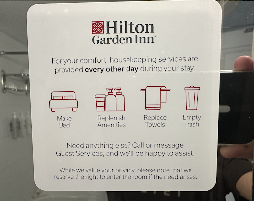 We've stayed here before and the place has been fine. It's a shame that they don't have a free continental breakfast (theirs costs $15 per person) but there are plenty of other places nearby. What made this stay a problem, and the reason for one "star" re: "Service" is housekeeping. We stayed 3 nights. In our bathroom is a sign saying that housekeeping service happens every other day. No problem. (I've included a photo of that sign in the bathroom). However, by our third day, close to 3pm, nobody had come by to clean the room. I went to the front desk and told him about the sign re: every other day, and he said that that isn't true, that housekeeping should be coming every day. I told him that we were into our third day without housekeeping. He said that he could get them to come "now" but I said that my wife & I had just returned to the room and will be going out after 5. He said that housekeeping leaves at 3pm and as such couldn't help me. (His attitude was underwhelming). As I walked away, someone who appeared to be head of housekeeping had overheard our conversation and told me he would get someone to come after 5pm. (He also said that housekeeping should come daily, and I told him about the sign). I thanked him. At 4:45PM housekeeping showed up. I said that we needed more time before going out, and they seemed a bit impatient, as if we were keeping them late, so we hurried up. What a shame, as we've never had a problem with this place before. Whether we return to this hotel depends on whether we ever get an explanation as to what happened -- including that strange sign in the bathroom. *** UPDATE 7-AUG-2025 Hilton Garden Inn reply included this text: "As for cleaning stayover rooms we usually do these after the checkout rooms to allow for guests to check-in on time. From Bruce Kanin: Thank you for your response, but I have no idea what that sentence means. You did not clean the room for almost two days in a row had I not said something. Frankly, cleaning of the rooms should take place starting in the morning when most people are away.