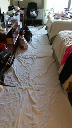 Last 2 nights, move up to the third floor, which was much cleaner than the grungy ground floor dorm room (thumbs up). yet... still no hot water (fail again), this time the bathroom fan didn't work (fail) finally some 21st century tv service (thumbs up). No more draft on the floor (thumbs up). Still a musty smell (fail). No luggage rack in the room, had to ask the front desk (which I will get to shortly) (fail). Ceiling is cracking to the point where the paint and drywall may start to rain down on someone's head.