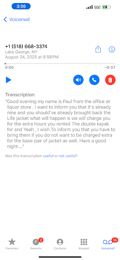 In the meantime it started raining, I dropped my phone in the lake and since we didn’t end up using the life jackets or going out I completely forgot about them; only to notice a bunch of missed calls and voicemails essentially harassing us for the life jackets and stating they will charge us per hour that they were not returned. I was under the impression that since it was raining I doubt other guests were waiting for us to return life jackets to go out in the storm.. why would they have called so many times as if were not going to check out tomorrow.. Also I didn’t even notice the calls or voicemails until this morning..