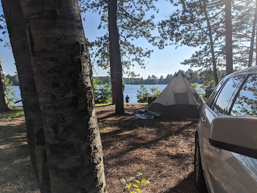 Read moreVery much the lakeside camping experience ideal if you want to waterski, wakeboard, Jet ski, etc with your family. If you're into paddle sports or seeking peace and quiet then you may want to go to Rollins Pond instead due to wakes, generators and general busy vibe. The groups to each side of us had been coming every year for decades. Despite all the kids and motorized gear the nights are very quiet and the loon calls are impressive. The camp sites completely surround the three-pond facility which leads to a charming dusk tradition of groups calling out "YOU WHO!" and waiting for a reply from across the lake. Many sites are big enough for 30ft+ trailers but no hookups. Sites are wooded but not so heavily that the shade is chilly. Bathrooms are close to all sites but shower building, and trash dumpster corral (only one of each for the 335 sites) is a 10 minute drive from the far-end sites. Don't worry about the showers since you will be in the lake a lot :). If you set a tent, watch the drainage since summer downpours can fill the area you thought was flat with inches of water that could flood your tent. The Trading Post store is 2 minutes by car and 5 minutes by bike from either gate and has it all, from ice to daily (except MON) BBQ (order a day ahead to insure you get what you want), great coffee, camping extras like those folding chairs you forgot to pack, souvenirs, fishing stuff, 2nd hand paperbacks, and so on. Groceries in Tupper Lake is 15 minutes, Saranac Lake is 25...