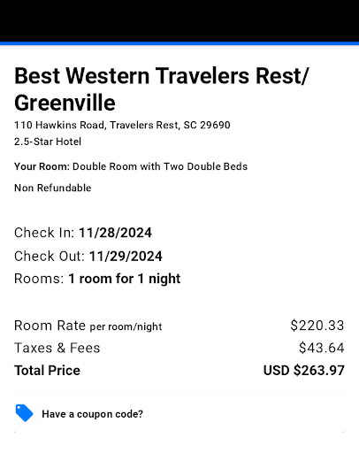 Unrelated to this location I do tend to enjoy Best Westerns and stayed at one in Colorado recently, much better experince, front desk took care of everything there for me and even tried getting me discounts and bonus points, I got no points for the Travelers Rest location either now that I think of it, but oh well, plus I didn't get charged fees other than the one the city I was in required (all hotels had to charge it...