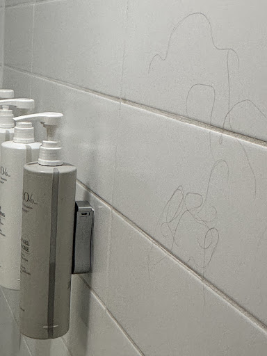 We were moved to another room on the 8th floor, but this one wasn’t much better. There were faded symbols written in marker on the walls in the bedroom and living area. It was obvious that a serious attempt had been made to remove the graffiti as the wallpaper had been scrubbed to the point of removing the pattern. There was also a leftover toiletry bag with the previous occupant’s prescriptions inside left on the TV stand in the living area.