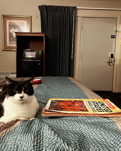 This is a suitable place to stay if traveling with pets and looking for an overnight stop. Check-in was efficient and I appreciated the ground floor room in the back. We were traveling with hard suitcases strapped to the luggage rack, and after a lot of thought, felt like our luggage would be safe, and it was. We were traveling with a chihuahua and a cat, and I really wasn’t expecting a fantastic room for such a low price; the room was clean with appropriate towels except it only had one washcloth, but it was obviously a room for people staying with pets: the doorway to the bathroom had obviously been chewed on and damaged by a large dog. We didn’t mind because the room was clean. It had a mini fridge and microwave, which not every motel 6 has. Bed was okay for one night. Pillows were small in size and number, but again, I wasn’t expecting more. The attendant at the front desk was a polite and hospitable young man. There is coffee in the front office in the morning. I do think a few personal welcoming touches and amenities would be an improvement. I knew from reading other reviews not to expect shampoo, and it was true there was no shampoo or conditioner available and no extra toothbrushes available for purchase even. Some type of welcoming info in the room or a list of TV channels or even restaurants nearby would have made me feel like they tried to provide quality hospitality. It’s not like I asked for suggestions since I can Google these things. If I had been looking for something more than a safe clean room to sleep in while traveling with pets, I’d have been disappointed, but I got exactly what I expected and paid for. My pets were delighted watching Law and Order. I’d stay again if under similar circumstances- safe for people and pets, no frills, very efficient check-in. Full disclosure- I smoke cigarettes and do not smoke inside and did not notice any smell of smoke or of previous pets. I read some other review that mentioned rooms smelling smoky and I didn’t notice...