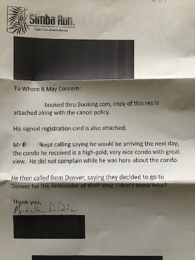 Michelle Davidson wrote a letter (see below) to my credit card company making up total lies about how I checked into their hotel which I never did. She also stated that I stayed in the room which I never did and that I never complained about the room which is the furthest from the truth. It was quite the opposite. (Remember it was documented with my credit card company the night before) She also came up with some lie that I went to Denver which was the biggest lie of them all because we told her we were in Vail and went back to meet her in person the following day only to be stood by her.