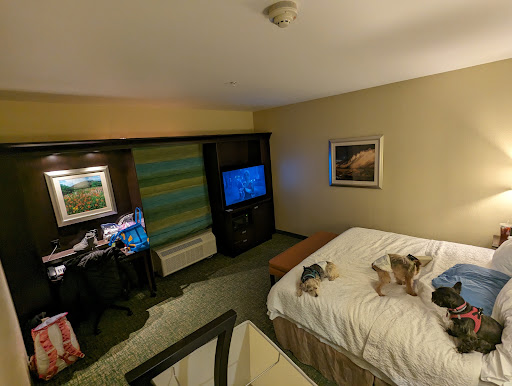 Rooms were setup a bit different than most hotel rooms. We kinda liked the headboard of the bed on the wall with the bathroom... Means you face the window if laying on the bed. Space of the room was good. It was just us 2 adults and 3 pups. Yes there is a pet charge, but it's one charge vs Holiday Inn being per pet. Rooms were clean, TV technology was pretty neat. Lighting all over the room, even inside the wall units around the window (desk, and TV) were a nice touch with the lighting. Bathroom was clean, and liked the shower and a decent shower head.