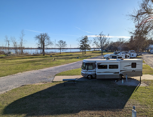 The big draw of the campgrounds is its location on the river. Since our site was in the front row, we were able to see parts of the river from inside our RV. The eastern edge of the campground is bordered by a wide public concrete walking path along the riverbank, high above the river. You can follow the path north for almost 1.5 miles, passing under the Natchez-Vidalia bridge, watching boats push barges up and down the river. Sometimes the boats will park along the side of the river.