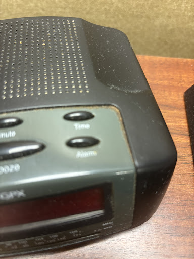Since I wanted to have the lamp next to the bed readily available, I opted to use the outlet across the room by the tv to charge my device. Looking behind the entertainment center, I noticed what looked like a chewing tobacco container and lid behind it.