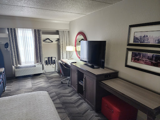 This is actually one of the cleanest Hampton Inn's I have stayed at in a long time. Room was clean and smelled good upon arrival. Walking distance to the Battery and is an excellent location for Braves games for that reason. Parking is really tight, they only allow one car per room because they sell part of their parking lot for game parking. So this was slightly inconvenient as we arrived around 5 pm for our stay and they had blocked off the parking lot to begin selling parking. So I recommend arriving early if you can if it's a game day, otherwise you might not get parking. Breakfast was actually better than expected. The waffle bar included sprinkles and chocolate chips and blueberries which was a nice addition. Otherwise pretty standard hotel breakfast, good selection of cereal, yogurt, fruit, eggs, sausage and your standard hotel bread section such as bagels and muffins. The hot water in our room was lukewarm at best and never really got hot for my shower. Overall, I would stay here again for a Braves game. It was clean and conveniently located and surprisingly nice based on the last few Hampton Inn's I have stayed in.