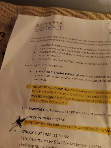 Overall the hotel is beautiful and conveniently located to popular destinations but the layout pictured on the website does not depict the actual hotel (i.e. the hotel shows a jacuzzi but only has a pool which closes at 8pm). I rated the hotel a 1 star because I did not receive a refreshing stay at the Sonesta Select Atlanta Cumberland Galleria. Sadly this is one stay Iâll never forget; this time away from home was appalling.