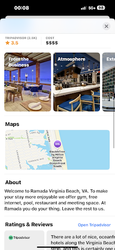 Read moreProfessional Review: DoubleTree by Hilton – Virginia Beach |As both a mom and a travel advisor, I tend to look at properties through two lenses: family practicality and overall guest experience. Our recent stay at the DoubleTree by Hilton in Virginia Beach managed to meet both needs in a way that I’d recommend to families and leisure travelers alike.||Arrival & Check-In|Check-in was smooth and efficient, which makes all the difference when traveling with children. The warm chocolate chip cookie welcome—a small detail—set a positive tone. Kaitlyn, the hotel supervisor, was exceptionally professional, helpful, and considerate in resolving a concern I had. Her attentiveness elevated the overall experience and reflected a true commitment to guest care. Luggage carts were plentiful and in good condition, eliminating the usual scramble many hotels struggle with. Kaitlyn, the supervisor ||Room & Balcony|The room itself was clean, bright, and in good working order. The bed offered excellent back support, the linens were fresh and clean, and I slept comfortably throughout my stay. The bathroom was updated, with clean tiles and everything in good working condition—another detail I pay close attention to. While there is no in-room microwave, one is conveniently located on each floor, next to the ice machine. Coffee is available both in-room and in the lobby. The balcony was the highlight, offering a comfortable, private space to enjoy the sunrise over the water—a luxury for parents who may not always make it outside before the day begins.||Beach Access & Atmosphere|The property’s beachfront location is a true advantage. Carrying beach gear with a young child was manageable, and the outdoor rinse stations were invaluable for keeping sand at bay. The location, closer to Rudee Inlet, draws a more subdued, family-friendly crowd compared to the busier areas of the boardwalk, which I appreciated.||Amenities|The indoor pool (3–5 ft depth) was pleasantly warm, safe for children, and consistently stocked with towels. A small but functional fitness center with water station is also available.||Design & Vibe|The hotel embraces the beach-town spirit with soft, calming colors and coastal-inspired décor. My favorite artistic touch was the foyer wall of shimmering blue glass tiles, reminiscent of ocean hues. On Saturday night, a band played nearby—fun for many, though from the 6th floor we could still hear the music clearly, so guests on lower levels may want to plan accordingly.||Dining Experience|The onsite restaurant was a pleasant surprise—clean, modern, and decorated in a way that balances coastal charm with a touch of elegance. Service stood out: our waitress, Caitlin, was professional and kind, and supervisor Kaitlyn displayed genuine attentiveness and professionalism that elevated the experience.||Final Assessment|This property is not designed to be a luxury resort, but it delivers well on what matters most: cleanliness, convenience, service, and family suitability. For parents seeking a straightforward, comfortable beachfront stay—with thoughtful staff and a calmer atmosphere—this DoubleTree is a...