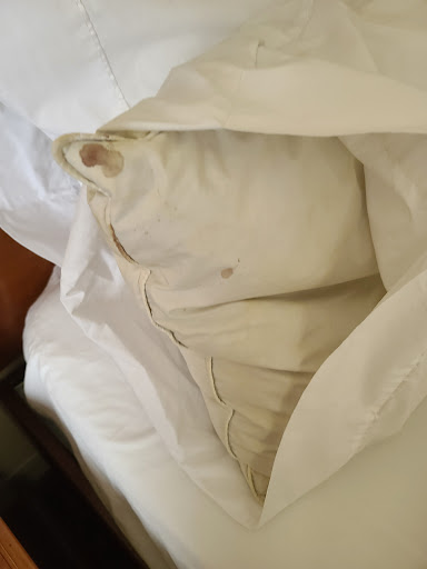 I would give it zero stars if I could. Hilton brand is usually my go to place for lodging. But this particular location was horrible. It was by far the filthiest Hilton and one of the filthiest hotels I've ever been in. You can see the photos for yourself. If it wasn't a business trip, I would have found lodging elsewhere. I should have known it was not going to be a good stay from the moment I walked into the place. When I walked in, instead of a warm greeting, the young lady at the front desk just stared at me. After an awkward minute, she looked at me and said "do you need something. Are you checking out?" She was very unpleasant. I told her that my flight came in earlier than expected, so I'd like to check in early if a room was available. As a Gold member, I can usually check in early by a few hours depending on availability. She replied with "well I doubt anything will be available this early." But when she looked, she said that there was availability. I knew there would be because it was a Tuesday in February. Nobody is coming to VA Beach in the middle of the week in the middle of winter unless it's for work! When she checked me in, she didn't acknowledge that I was a Gold member (but that's OK, I wasn't offended by that, even though I'm supposed to get a gift upon arrival). She gave me a room on the 5th floor. I had to ask her where the elevator was, and she seemed bothered that I asked. When I got to the 5th floor it was filthy (see photos). Trash was throughout the hallway, the carpet was dirty; it looked like it hadn't been cleaned in months. For the 3 days I was there, the same trash remained in the hallway... the entire time. To make matters worse, when I got to my room, I noticed that the bathroom was not cleaned. There was urine on the toilet and the tub was dirty. The bed was not made, sheets on the bed were yellow, and there was blood on the pillows. It was gross. I immediately texted the front desk through the app and went down to talk with someone about the room. They assured me that someone would be up to clean it. About 30 minutes later, a housekeeper named Kevin showed up. He was listening to some vulgar comedy show and music without headphones. I watched him clean the bathroom, then I had to step out for a minute. When I got back, the dirty, soiled, bloodied linen was still on the bed, when I specifically asked for brand new pillows and linen.