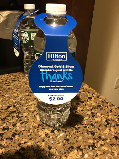 None of this is very bothersome, but what really detracts from the Hilton experience here is the nickel and diming that occurs once you check in. Bottles of water are offered in-room at $2 a pop, and there is “complementary internet access” that is awful. I was texting with another member of my party and she was missing the messages because the “complementary” connection she was using kept kicking her off and she repeatedly had to re-establish her connection. Needless to say, there is “premium internet access” offered for an additional fee to non- Hilton Honors members, just like the in-room bottles of water.