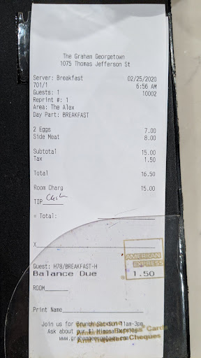 We chose this location because we love Georgetown and we wanted to be in a good location to walk to everything. The Graham certainly fits the bill here - it's close to all kinds of restaurants/bars in Georgetown as well as the waterfront - it even has its' own rooftop bar that they are working on! Check-in experience was good, but could've been better. Valet was great, super quick & helpful (which is good, because you're sort of blocking a one-way street when you park for valet). We walked in to the front desk at 3:41 and were told the room wasn't ready for check-in yet. The lobby was full (with other groups also waiting to check-in) and we had our dog with us - so we went back outside and walked in the rain for a bit until we received a text from the hotel at 4:01 that the room was ready. I understand most hotels have a 4pm check-in, but I definitely struggle to believe that the room ACTUALLY wasn't ready when we first walked up and that they really needed another 20 minutes to have it ready. It felt more like them sticking hard and fast to their rule which was frustrating. Thankfully we were back to the hotel as check-in began and my wife realized she got a key virtually so we didn't need to stand in line and wait - which was a huge relief because the main elevator was out of service and we had to wait for the much smaller service elevator. We ended up first in line for this thanks to the virtual key, but there was a tremendous line behind us and the elevator only fit 3-4 people comfortably so that must have been a terrible wait. I would imagine they could have easily avoided this line if they simply began checking people in gradually prior to 4 rather than creating this problem for themselves by limiting everyone to the same check-in time. Got up to the room which was lovely and perfect for our group and had a nice view. We like it cold so we always turn the AC down as far as it go as soon as we walk in. About an hour later it hadn't cooled down much from 71 and so we called down before going out for dinner. They sent someone up RIGHT AWAY which was great and he said they had just switched over from heat and he needed to change something to allow AC to flow. Great. We get back a few hours later after dinner and drinks to find that the room has heated up to 80 degrees - we call down and a few minutes later they send someone up with room keys to move us down the hall to another room. It would have been nice if they brought a luggage cart up with them, but we happily fled the hot scene and went down the hall. When my wife booked the rooms via their website she added credits for breakfast. We sit down at the breakfast location directly next door and mention that we have breakfast credits on our room. The gentleman running the restaurant must have checked this with the front desk, so the gentleman from the front desk comes over to insist that he does not see breakfast credits on the room. My wife pulls up the email confirmation from the Graham showing clear as day the charges broken down with $120 of breakfast credits as one of the last line items. He continues to insist that it is not on our bill and that he can show us if we want. Finally the kind man running the restaurant says "why don't we comp this and figure it out later" which was good because the man from the front desk was nowhere near a solution, he just kept insisting what was and wasn't on our bill. Thankfully he put us in touch with Anton who was very kind and understanding of the whole experience and helped to make things right. We would definitely come back here for the location and hope for better luck with the room conditions and probably avoid the breakfast credit thing since there are many good places to eat nearby. Could've been a horrible experience if not for Anton stepping in and helping sort things out. Very grateful for him and will...