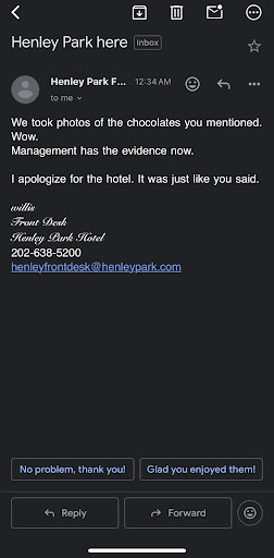 Read moreI was excited to stay at a cute brick historic hotel bc it’s so different from the more modern designed hotels. My stay started out fine, nothing spectacular, the rooms are tiny but I was comfortable. I was there to visit friends and go to the convention nearby. On the 2nd night on my way back in for the day I saw a big rat on the street, not the hotels fault by any means so I wrote it off. The next day I was coming in from my convention and touring the city, I go into my room and I notice a piece of wrapped hersheys chocolate on the nightstand that I had left was chewed up and nibbled. I knew right away there was a rodent (rat or mouse) in the room. The hotel offered another room immediately but I have a phobia of rodents, I checked out and left thinking I would get a full refund for the inconvenience. The front desk did not offer to help me find a different hotel or transport and I left walking with all my bags across the street. The doorman was nice enough to help me with my bags to cross the street to the Marriott marquis which was also holding the convention. The front desk man at the Henley even seemed upset at me but then later that night I got an apologetic email (attached). The hotel took pictures and luckily didn’t deny the allegation. I also took pictures (attached) but was too scared to look under the bed. On the first day I did look under the bed after dropped something and it was very dirty with crumbs but the bed frame is too low to the ground I know they can’t get a vacuum underneath. Makes me wonder if the whole hotel had a rodent issue and they already knew the drill. I understand things happen but I would expect hospitable service and a full refund. I am not a combative person and was very nice but when I went to speak to the manager which I think was named Erick the next morning, he became a bit combative/argumentative with just a little push back and was extremely unprofessional. He told me he would try to get me a full refund. When the refund began to take more than week to be reflected I decided to call chase travel since I booked through them. Chase travel went through 3 different managers who refused to give me the full refund. I paid for 5 nights and left on the 3rd day, leaving 3 nights. They only agreed to refund me much less than half of my stay which doesn’t add up at all. Now it’s been 3 weeks and I still haven’t seen any refund at all. When I call them they say it’s Expedias fault (I booked through chase travel). They tell me to call Expedia and when I do there is no information from my stay bc I didn’t even book through them. Chase travel says it’s the hotels fault. So at this point all fingers are pointing to the ignorance of this hotel. This whole situation is so frustrating, I tried to kill them with kindness but now I learned it does not pay to be kind in these types of situations. It was so expensive to get another hotel same day and Henley park hotel should have offered at least some kindness and assistance. Stay away from this hotel as it likely has a rodent...