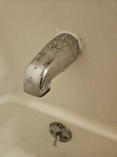 The final door led to a bathroom. The putatively charming claw-foot tub was approximately half the size of a normal tub, and draped in a pair of worn plastic curtains. I can only describe the floor of the tub as recycled plastic rug, maybe there to prevent falls. The showerhead rose ominously from the tub plumbing, terminating in the rusted rods suspending the curtains.