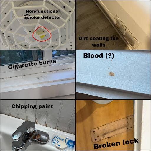 We were in room 15K, which is a one-bedroom "suite." The first thing that we immediately noticed as soon as we walked in was a strong musty odor. It was not pleasant at all and it sent my allergies into overdrive. Next, we noticed that there were no blankets on the bed, just a sheet (which had dirt on it) and a VERY thin bedspread that felt more like a tablecloth and was not the least bit comfortable or warm. It was even too small for the bed. It was quite chilly and rainy all weekend, so we were definitely cold without any actual blankets. It didn't help that the heat in this place was not efficient and the heat pump did not seem to work properly. The clips on the curtains in the bedroom were broken, so they were hanging off the curtain rod, so we couldn't close them all the way.