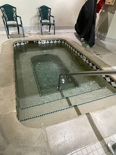 They have a pool. The temperature was perfect. The shallow end is 3 ft deep.The deep end is 5. Hot hot tub. There is an ADA seat for each. No sauna.