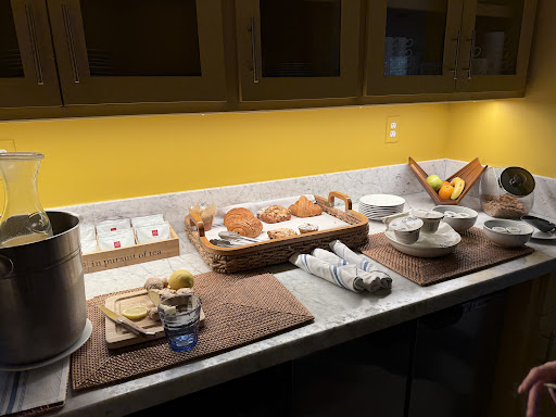 They serve a lovely little continental breakfast with pastries, fruits, juice and coffee (they even have oat milk!). Enough to hold me over till brunch.