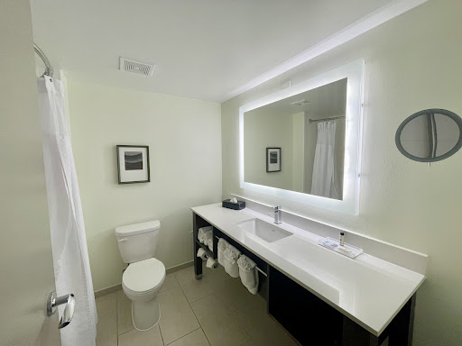 Stayed there 3 nights. I should have limited it to 1. I asked for an accessible room and they gladly accommodated me with a room that had a shower that someone ( not me) in a wheel chair could roll their chair into the shower stall. Unfortunately, i wasn't aware that the shower curtain had to be positioned accurately or the water would go under the curtain and all over the floor -- very slippery. The bathroom was very spacious... helped by the very small sink with no place to put your toiletry items... unless you count the small wire rack near the door. The bedroom was very spacious as well. I found a metal bracket, just about at ankle height, sticking out from under the mattress. Thankfull I saw it before i hit my foot against it. I'm sure that would have required a trip to the Hospital for stitches. I zip tied a towel to wrap around it do I would not be injured. I was not aware that Marriott hotels are trying to cut corners by not offering routine housekeeping services if you stay there 3 days or more. I wondered why there was no water provided the second day of my stay so I asked the desk if I could have a bottle of water. I was rudely advised of the No Housekeeping services and told that I could have one this time but I would have to pay in the future. I thought that their Bonvoy members were granted that tiny perk. I was prepared when I went to the Marriott Aloft in Wilmington NC. Check that review if your interested.