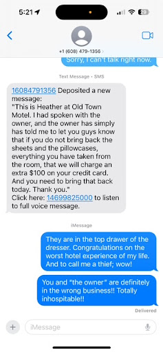 Read moreIn town for a wedding we got 2 rooms one for my kids and a pet friendly room and they accused my kids they where smoking in the room which they are not of age in the first place. Told the girl the night we check in that we had our dog so we would get charged the correct amount which I paid that night so wouldn’t have to worry about it at check out. which she didn’t charge me and the guy was rude about it. Felt like I was being harassed called both days and day of check out. In the morning I was upset due to being on a budget I said the girl should of made sure that she charged me the correct payment and when I stated that your person messed up I should get accommodation for the mess up he was just rude. I felt like the room my kids where in didn’t get cleaned due to them accusing. Do they do this thing on purpose? I will not be back to this place. Nor will I recommend it to others. Go stay down the road or up in lacrosse. Which the was supposed to be a happy time for my family due to the wedding it was nothing but stressful for us and my aunt n...
