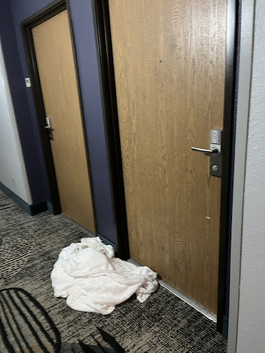 Photo is of towels left in front of my door by people in next room. They remained there...