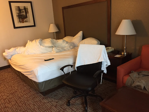 When I arrived around 6:15 PM I went to my assigned room and it looked like it had been tossed by the police. I knew it had not been cleaned since the last occupants but I was also glad I had not met them. I've since felt sorry for housekeeping at every hotel I have visited. If we had to look at that room at the start of our day, most of us would quit. The pic here doesn't include the bathroom and you're glad it doesn't.