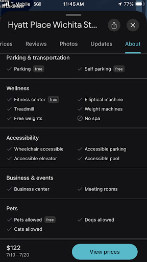 Read moreWhile trying to check in my receptionist would not give me a clear answer about prices. She DID NOT ask if we wanted a bathtub. The nightshift reception person kept blocking off areas that are open usually so he could sit back at the table. I was on a important phone call and he was asking me questions which was extremely rude. I was trying to get to a silent area so I may hear my phone call better instead he blocked the area off as if we wasn't allowed in that area when I asked he said we are allowed in that area. The music was annoying. The hallway carpet looks like they picked the cheapest crap people can pick on and it'll be okay. They art mostly matches the puck floor. No balcony no hot tub not many amenities all staff was rude accept the only man of color whom works the front area he was the ONLY ONE Who both treated us made us feel welcomed and helped with any questions I had. My bf works at the other Hyatt in Wichita and nobody helped us to get his discounts. The Hyatt doesn't care about their employees and it shows in the way they approach anyone who walks in the door. They hotel definitely needs a whole make over it's far from luxury you usually get at any...