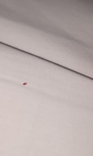 I've never written a bad review before so this took me awhile. I was on a long road trip and needed a place to stay for one night, and since I'd had a great experience at a previous motel 6, I was excited to reserve a room with the company again. At first everything was great, the room was clean and staff were super friendly. Once I turned off the lights though, I started feeling extremely itchy. I turned my phone on and saw a big bug climbing on my elbow. I freaked out, got up and turned the lights on and found a bunch of bright red dots all over the sheets moving around, obviously bed bugs. There were between 8-15 small red ones and two much bigger browner ones. I immediately dragged my dog to the shower and rinsed him off with hot water, luckily I didn't find many on him. Then I changed clothes, threw the clothes I was wearing away and got out of the room ASAP. I let the lady at the desk know, and she stated she couldn't do anything except take the room key and give me her managers name to call in the morning. I went to Walgreens and got garbage bags to put my electronics in and threw everything made of fabric away, and luckily found another hotel with one room left. The following morning I called Ron the manager and all he said is that my dog had fleas and he refused to acknowledge any kind of problem before I could even ask for a refund. I don't know how fleas suddenly became bright red, liked people and sheets more than dogs, only came out in the dark, and only show up at one hotel and not any others before or after this reservation, but I am 100% certain they were bedbugs. Unfortunately I didn't think to take pictures until right before I ran out of the room, and at that point the light had scared most of them away, but here is a picture of one I found...