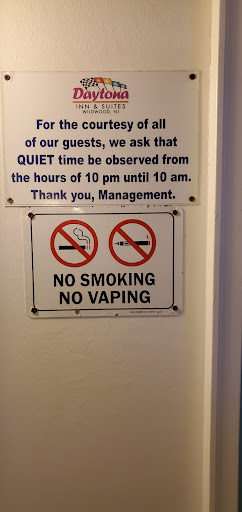 We have stayed at Daytona for the last 3-4years.|Always in the same room and it's been a great place.|That was not the case this year.||Most of the motel was occupied by bikers.|Bikers in general are no problem and these ones seemed like nice people.||The problem is they were loud|and they congregated just down from our room.|Most nights some of them were outside, laughing and being loud until after midnight.|One of them had a large dog that barked a lot.|Most of them smoked or vaped, where they were sitting in the walkway.||The motel has a strict policy of quiet time after 10pm.|This sign was on the wall between their rooms.|There is also a sign, opposite where they sat, specifying the designated smoking area in the back parking lot.||Management knew about their behavior and allowed it.|This has never been allowed to anyone else any other time we were there.||We paid a lot of money to stay there for 5 days.|I realize all the bikers also paid a lot and as a group they represented big business to the motel.|It sounded like they are a yearly regular.|This should NOT give them special privileges and allow them to break the rules while Management turns a blind eye.||If that's the case, then Management should close the motel to anyone else or give a discounted rate and notice of the conditions to others.||This is totally unacceptable behavior from the management.|It is also very bad business practice as people will not want to stay there.|It is very unfair to other unknowing, paying, customers.|The rules should be the same for everyone.|Rooms: 5|Service:...