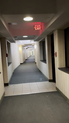 Floors & Interior After checking in, my group and I went to use the elevator. It stopped on every floor, but not a single person was on the other side. The second floor was super dark and had poor lighting down the hallway. On the fourth floor where the elevator button is, wallpaper was peeling off the wall. Both rooms were on floor 4. We opened the door to the room and struggled to find any of the lights in the room (only the bathroom and the hall light had switches). When we were finally able to see the room, a giant noticeable red stain was on the floor, the first thing you see when opening the door. In between the two beds was a crusty stain that looked like plastic was melted into the ground. We had a mini fridge in the room which I made the horrible mistake of checking inside of it. I opened it and a cockroach was crawling around on the inside. I immediately shut it. The carpet was disgusting and looked like it needed more than just vacuuming, shampooing as well. I never felt comfortable walking in the room barefoot so I kept socks or shoes on the entire time. Where the thermometer was on the far side of the wall, there was a giant hole in the wall. Pests, roaches, and other animals could crawl through there. The air filter inside of the vent was caked in dust and clearly hadn't been changed in who knows how long, since the place was probably open. The parking lot was filled with trash and never got picked up by staff. Navigating yourself to the pool was like a maze and I felt like I was going to get lost. The hallways were hot and had a thick smell to them.