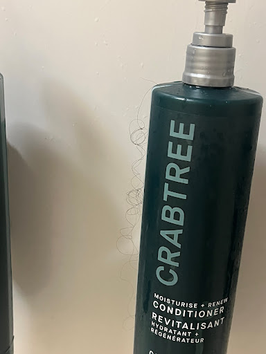 Two bottles of shampoo and one bottle of conditioner with no body soap in the master bathroom.