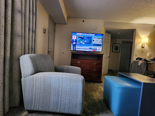 Okay so I gave four stars, I would have given two-and-a-half to three stars if it had not been for the staff. I am terrible with names so I will just described the staffs position when referring to them except for one number. We arrived at the hotel in the early evening and the gentleman who created us did so with perfect professionalism and perfect friendliness. He was attentive to any needs and me checking in a complete Breeze. During my time there I came into contact with this gentleman on multiple occasions and everytime I was greeted in the same manner. It was very refreshing to have someone who kept our needs in their mind such as my wife needing to get her scooter through doors. As far as the two gentlemen that or in charge of breakfast oh, they were awesome. The food was always hot, the area was impeccably cleaned and stocked with everything we needed. When they saw that I need to bring food back to our room they were, without asking I might add, ready with a tray and other things I might need. They were both friendly and extremely helpful. The cleaning staff was perfect. Have to say I did not even notice them unless they sad good morning or asked how I was enjoying my stay along with what I found to be the question every staff member asked which is, "...is there anything I can do for you oh, anything you need?" The last member of the staff, who I do remember her name do to it also being one of my daughters stuffed animals names when she was younger, is Kate. She was there multiple times and was also there when I checked out. I was able to relay all issues to her and she took the time to listen and was attentive to all my concerns. It is one thing when a staff member asks how was everything but it is far different when you can see that they really care about the answer oh, and Kate definitely cares. I have to say, and this is to the general manager that your staff deserve some serious praise, and probably a raise tooš okay now to the problems. Number one it seems like Hilton has given up on the higher-than-expected amenities when it comes to their hotels. This is not the first Hilton that I've stayed with and it is only recently that we are experiencing less than desirable stay. The Wi-Fi sucks. And this is an issue because my family and I needed to access the internet and our phone service for not just my work but also our vacation. Hotels just the same as hospitals have notoriously bad service for almost everybody who uses a phone or computer. We had to use our regular service because the Hilton Wi-Fi was unreliable. Although the complimentary breakfast was always well stocked, hot, and clean , it wasn't very good and the variety was lacking. Again I think this is more a problem with Hilton than this location. Some fresh fruit, some more healthy choices, would probably go a long way. Not to mention having coffee available 24/7 wo We rented a sweet for our stay which was 4 days with children. I really expected the rum to be better stocked with kitchen utensils. But of course knowing we were going to a Hilton we brought our own just in case. I still had to go out and pick up a few things that we failed to bring but it should have had more from the get-go. The last thing is that we have been Hilton Rewards members from the early 2000s and every time we go to a Hilton we need to re-sign up. It's frustrating to know that if this little issue was not the case that we would be offered rewards on the amount of times we've stayed within the Hilton franchise. I feel like we're being taken advantage of.