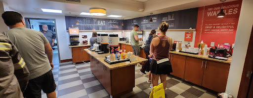 In the morning, there was a breakfast served. There were a number of items to note including eggs with cheese and sausage, pork sausage links, roasted potatoes, waffles, oatmeal, cereal, juices, coffee, bagels, muffins, as well as paper plates, napkins, and plastic utensils. I did hear a guest ask for just regular scrambled eggs, and the staff seemed to be accomadating. The sitting area next to the lobby was busy and had limited seating. The staff did their best to keep up with keeping items stocked, but once again, there were a significant number of people all trying to get breakfast.