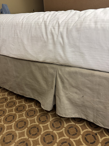 The poor experience starts at the doors with filthy glass and a sign demanding work boots be stomped off outside. Given the nature of the work done in the area, a kindly worded request with some boot scrubbing equipment might do but this came off as harsh. |Then, I came in to the desk to check in and there was a sign. Ring the bell or call this number for assistance. I rang the bell and waited patiently. After a couple of minutes I tried calling. And then I tried again. And again. Eventually a woman with two leashed dogs came in and said the dogs made it take a lot longer than it needed to. |The floors in the lobby were grimy, the tiles in the elevator chipped, but again, you write some of that off to normal daily wear and tear that cleaning staff might not have gotten to yet. |But the room. Ugck. There was no cushion on the window seat. The only chair in the room was filthy. Stained and wood chipped. So, I sat on the bed. And while I was there I noticed that there were streaks across the AC unit like a boot scuff in one area and then up higher there was a grey...what was that....fuzzy....UUUGGGG. The filters on this AC unit haven't ever been cleaned. I seriously took them out of the unit because my eyes were BURNING from all the allergens. |The floors looked like the vacuum they were using had never been serviced either and things were ripped and torn in the corners. |Overall, the place looks like the owner never checks in on the manager and the manager doesn't give two hoots. Will not stay there again. Do not recommend. Recommend finding...