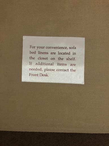 Read moreThis was our second, and most likely, last stay at this hotel. Check-in went smoothly and the front desk person was very friendly and informative. However, it went downhill from there. We were given room 716, which was described as a king studio with sofa bed. We were in town for a college convocation and commencement so we checked into the room, unpacked our things, and went to the convocation. When we returned and got ready for bed, we attempted to open & make up the sofa bed. Turns out it was not a sofa bed, despite the sticker on the sofa, that stated It was a sofa bed and linens were in the closet (photo below). No sofa bed and no linens - grr! Tried to call the front desk from the phone that had a sticker for room 323 – no one answered at the front desk nor did anyone answer at housekeeping, so we ended up calling the main number from our own phone. The front desk told us to pull up the bar on the sofa bed, as if we didn’t know how to work a sofa bed. We told him that there was no bar so he sent maintenance. I apologize for these unkind words - the maintenance guy looked like a crack addict and barely spoke English. He checked the sofa and realized what we already knew, so he left the room & contacted the front desk who called us saying we could change rooms. Not at all convenient as it was after 11pm, we were already dressed for bed and we needed to be up early for the graduation. But we had no choice since there were 3 of us so we moved to the room next door which was much smaller & much warmer than the other one.