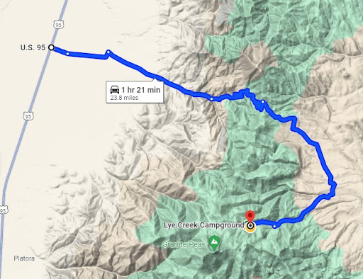 This is not for the casual camper. The road is long (24 mi from hwy 95, 18 mi from Paradise Valley) and it is first gear 10-15 mpg all the way. It is a dual track, soft center, raised crown with many embedded and loose rocks. Very narrow road with steep banks on either side. There are no washboards or sand but several low spots have mud ruts which means there will be potentially deep muddy tracks for short distances if it gets wet. I rode a fully loaded BMW 1200GS dual sport motorcycle up there and it was quite a challenge. Must air down your tires! If you drive a camper ensure everything is tied down or you will break a lot of dishes! I do not recommend a trailer as a few of the switchbacks are climbing, tight, steep 180s. Pullouts for passing are few and far between. Google Maps has the roads so you can navigate to the site and watch the distance as you progress.