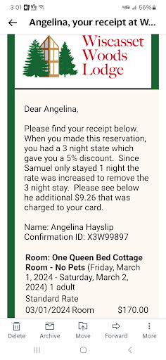 Read moreThis lodge and cabins property is clean, convenient and full of special touches. The only detractor is the close proximity to busy (noisy) route 1. The lodge itself is set back more and has a few cabins directly attached which would likely be quieter. Some of the wonderful touches: privacy - while the appearance from the front is that of a motel, walking out to the back deck shows the spaces between what are actually individual cabins; fire pits with free fire kits provided for the asking (s’mores kit also available for a charge); an easy serene trail through the woods behind the buildings; custom breakfast delivered to your room with hot and cold options; a scavenger hunt of nature items scattered over the property; corn hole games outside and board games available for borrowing; the binder in each room includes a fascinating history of the property and descriptions of lighthouses, forts and other places of interest within a 50 mile drive or so. It was just the two of us but WWL would also be a great place...