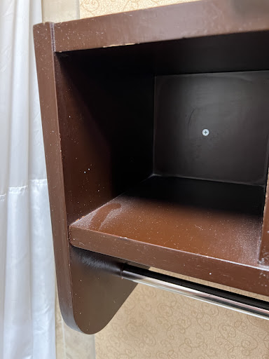 *See picture. In the bathroom there is a wood towel holder on the wall. The large towels are rolled and placed in the hole. There is a large amount of dust in these holes. They are replaced after every guest but never actually wiped clean. Gross.