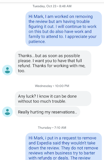 Upon reading this review the owner continuously called my cellphone expressing that he would give me a full refund if I would remove this review, because it was "hurting his business." I looked into it because the request was tempting...against my better judgement. While speaking with Expedia the owner continued to call and text saying he'd like to be able to give me a full refund so I would need to get it done asap. Which put some pressure on me because it sounded like he wouldn't refund me entirely if I didn't speed up the process. Expedia denied the request because they don't think it's right for owners to buy their way out of bad reviews. I agreed and caulked it up to being meant to be, accepting it as a bad night and forgoing the refund. I communicated the decision of Expedia and the owner replied he never request a removal for a refund. This was not true considering it's in text and clearly stated. I still haven't received a refund, Expedia looked into it and said the owner had denied such refund.