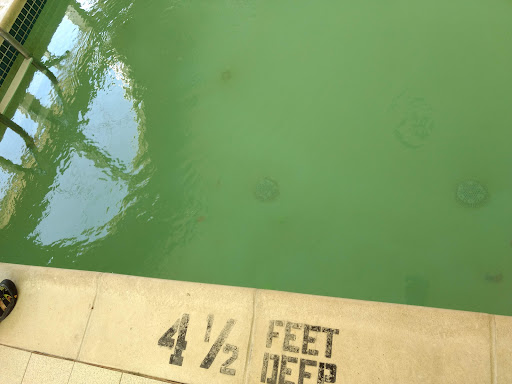 A. Pool is cloudy, greenish-brown and appears to be growing something, despite string chlorine odor. See photos. You can see where someone sat or rubbed a step clean, while the rest is covered in green-eyed slime.